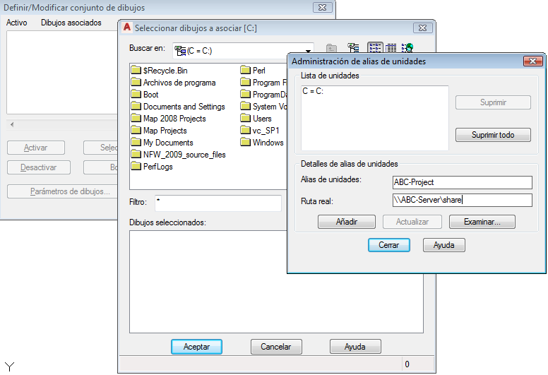 La ubicación de los dibujos se encuentra ahora asignada al alias de unidad. Ahora puede abrir los dibujos en esa carpeta sin definir ningún alias más.