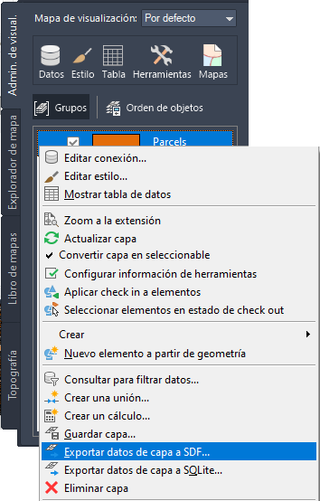 - En el Administrador de visualización, haga clic con el botón derecho en la capa Parcels y haga clic en Exportar datos de capa a SDF.