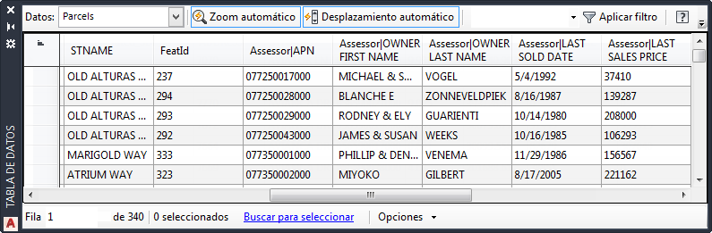 Ahora la capa Parcels muestra datos unidos. No obstante, los datos unidos en la Tabla de datos se muestran de color gris. El texto gris refleja el hecho de que los datos unidos no forman parte del banco de datos original. No puede editarlo ni utilizarlo en una propiedad calculada.