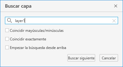 - En el cuadro de diálogo Buscar capa, especifique una palabra clave para buscar en el nombre de capa y elija una de las opciones siguientes: