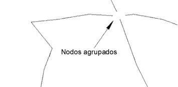 Utilice Agrupar nodos para corregir varios nodos cerca del mismo punto. La acción Agrupar nodos busca los nodos situados a una distancia inferior al radio de tolerancia de otros nodos y los agrupa en una única ubicación. Los nodos situados en los extremos de las líneas y polilíneas se incluyen automáticamente en esta acción de limpieza. Puede incluir también nodos independientes (puntos y bloques).
