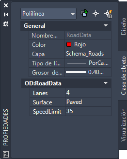Si selecciona un objeto creado mediante la clasificación de objetos, las propiedades asociadas a esa clase de objeto se mostrarán en la ficha Clase de objeto de la paleta Propiedades. Por ejemplo, si selecciona una carretera, la paleta Propiedades mostrará la capa, el grosor de línea, el tipo de superficie y el número de carriles. Edite propiedades introduciendo nuevos valores en la ventana.