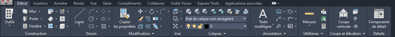 L'onglet début contient les outils les plus fréquemment utilisés. C'est là que vous trouverez les outils d'objet et de dessin de base, ainsi que des fonctions fréquemment utilisées telles qu'outils de modifications, calques et annotation de base. Servez-vous de l'onglet début comme point de départ pour vos nouveaux dessins.