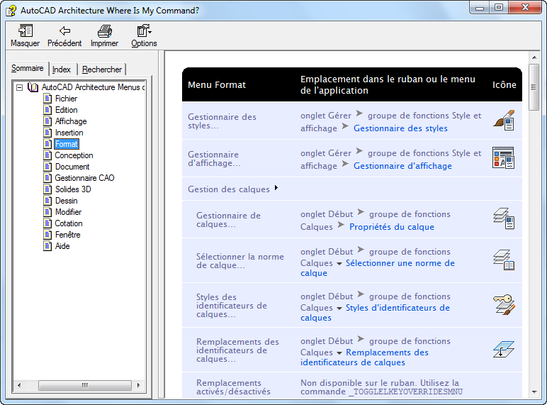 Le Guide de recherche des commandes est un fichier d'aide qui recense toutes les commandes en fonction de leur emplacement dans l'ancien menu et qui donne leur emplacement actuel sur le ruban.