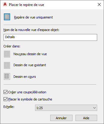 - Si vous désirez ajouter un symbole de cartouche dans une nouvelle vue de l'espace objet, activez l'option Placer le symbole de cartouche.