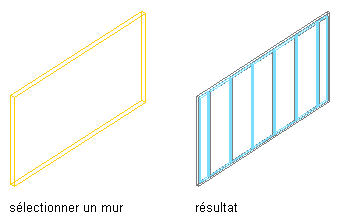 Cette procédure permet de créer des murs-rideaux basés sur des murs standard existants. Pour chaque segment de mur, un mur-rideau distinct est créé. Durant la conversion, vous êtes invité à sélectionner un style de mur-rideau qui détermine le nombre et la taille des cellules de la grille du mur-rideau ainsi que l'apparence des cellules, du dormant ou des meneaux.