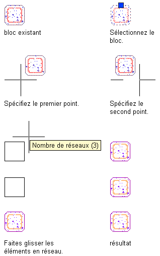 Cette procédure permet de créer un réseau de dessins au trait identiques (tel que des hachures ou des polylignes), des objets architecturaux (tels que des portes ou des murs), des polygones AEC ou des objets reposant sur un profil (tels que des extrusions de masses élémentaires ou des espaces). Vous pouvez également mettre en réseau tout contenu basé sur un bloc (y compris les composants de détail) constitué de ce type de dessin au trait ou d'objet.