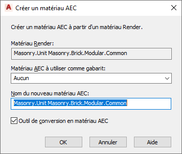 - Vérifiez que l'option Outil de conversion en matériau AEC est sélectionnée.