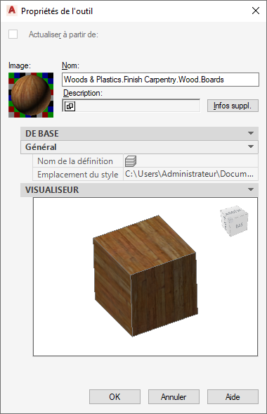 La création d'un outil de matériau dans un dessin implique la création d'une définition de matériau dans le Gestionnaire des styles. La définition de matériau est utilisée pour créer l'outil de matériau, mais peut également servir à différentes fins dans le dessin, par exemple pour créer des styles d'objets.