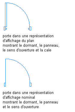 Il est possible de tracer un objet unique de différentes façons, en fonction des besoins individuels des différents types de dessins. La représentation en plan, par exemple, permet de tracer le panneau, le dormant, la cale et l'angle d'ouverture d'une porte. La représentation nominale, par exemple, permet de tracer le panneau, le dormant et l'angle d'ouverture d'une porte. Ces deux types de représentations permettent de tracer le panneau de porte, mais pas de la même façon. La représentation en plan représente le panneau de porte sous forme de rectangle, tandis que la représentation nominale le présente sous forme de ligne unique.