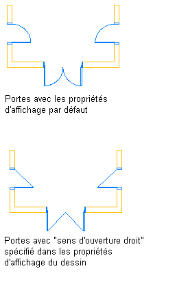 Lorsque vous n'utilisez pas de matériaux pour gérer l'affichage, vous pouvez personnaliser l'aspect d'un objet en modifiant ses propriétés d'affichage en fonction de la représentation d'affichage. Vous pouvez, par exemple, désactiver l'angle d'ouverture de la porte dans la représentation en plan, indiquer si l'ouverture doit suivre une ligne droite ou un arc, spécifier le pourcentage d'ouverture ou modifier le calque, la couleur et le type de ligne de l'ouverture.