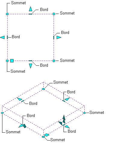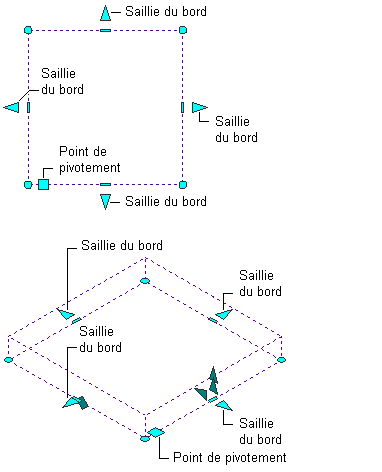 Les types de poignées d'édition disponibles pour une dalle ou dalle de toit sélectionnée dépendent de la direction de visualisation. Comme le représentent les illustrations suivantes, les poignées de bord, de saillie de bord, de sommet et de point de pivotement sont affichées dans les vues isométriques ainsi que dans les vues 3D en plan. Les poignées d'angle, de décalage vertical, de décalage horizontal et d'épaisseur sont uniquement disponibles dans les vues isométriques 3D.
