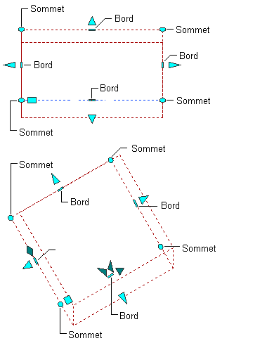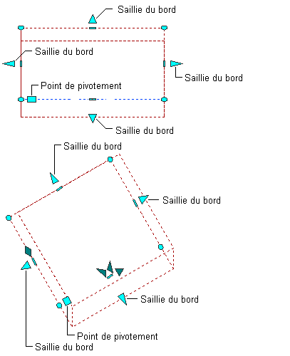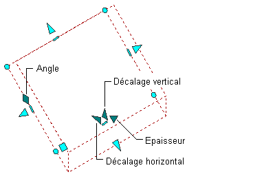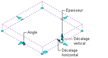 Différents types de poignées d'édition sont affichés pour les objets dalle ou dalle de toit. Vous pouvez faire glisser ces poignées au besoin pour repositionner ou redimensionner l'objet ou indiquer des valeurs d'angle ou de distance précises à l'aide de la fonction de saisie dynamique. Lorsque vous sélectionnez une poignée, appuyez sur la touche Ctrl pour en afficher les différentes fonctions.