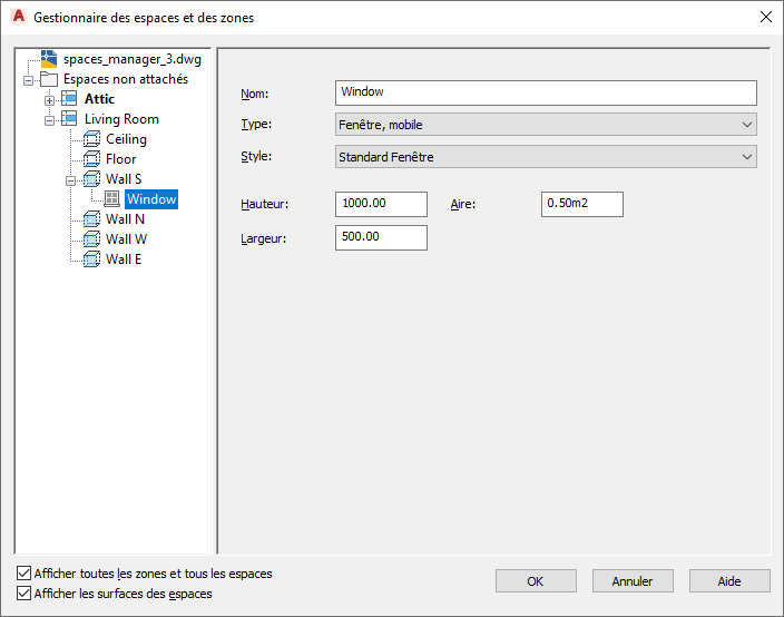 Dans le cas des espaces 3D de forme libre, l'aire rapportée est affichée avec l'aire globale. Lorsqu'une partie seulement de l'ouverture se situe sur la surface, l'autre partie résidant sur une autre surface ou en dehors de l'espace, l'aire rapportée est différente de l'aire globale. Dans ce cas, l'aire rapportée concerne la partie de l'ouverture qui se situe sur la surface. La valeur de l'aire rapportée est en lecture seule. |