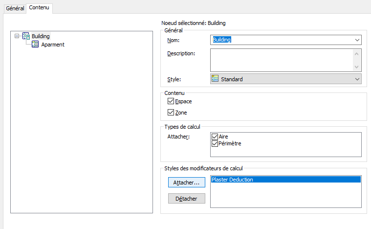 Remarque : Par défaut, un modificateur de calcul s'applique seulement à l'aire de base et au périmètre de base des espaces attachés à la zone. Pour appliquer le modificateur aux contours net, utilisable et brut des espaces attachés à une zone, vous devez créer et appliquer une définition de jeu de propriétés qui contienne les propriétés des valeurs calculées de l'aire et du périmètre de ces trois contours.
