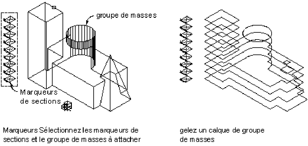 Cette procédure permet d'ajouter des masses élémentaires ou des groupes de masses à une section afin de créer l'étage de l'édifice. Vous pouvez geler le ou les calques contenant les masses élémentaires et les groupes de masses pour afficher uniquement les sections.