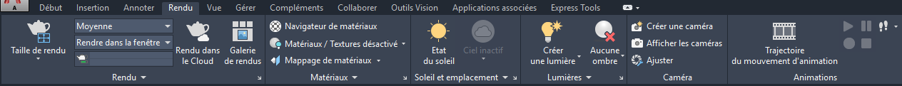 - Rendu. Contient les commandes permettant de créer le rendu de tout ou partie d'un objet, de générer un fichier de sortie du rendu et d'ouvrir la palette Paramètres avancés du rendu.