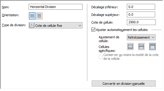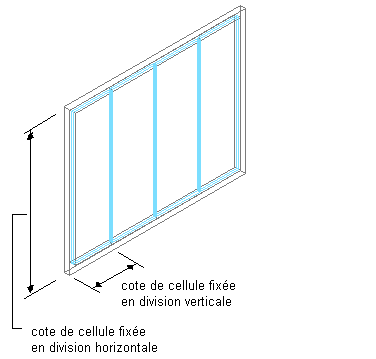 Si vous définissez une division verticale, la cote de la cellule est la longueur de la cellule entre deux meneaux. Si vous définissez une division horizontale, la cote de la cellule correspond à la hauteur de la cellule.