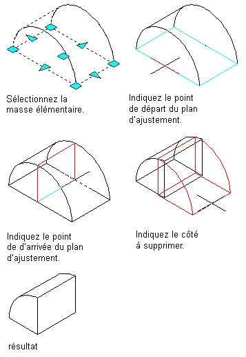 Cette procédure permet d'ajuster une masse élémentaire. Le plan de division indiqué fait office de ligne d'ajustement. Vous devez alors préciser le côté de la masse élémentaire à supprimer.