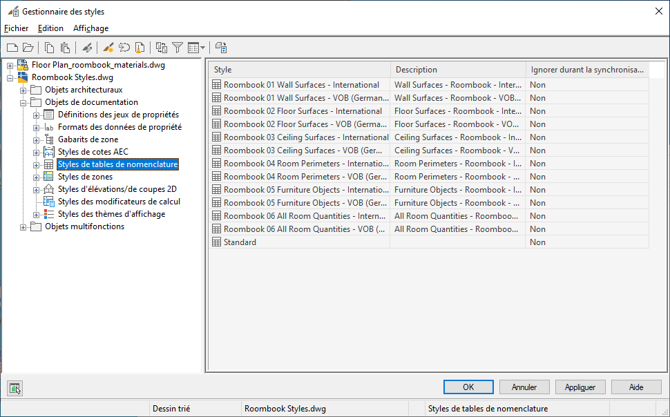 2. Dans Styles de tables de nomenclature, importez les styles de tables de nomenclature Roombook prédéfinis dans votre dessin.