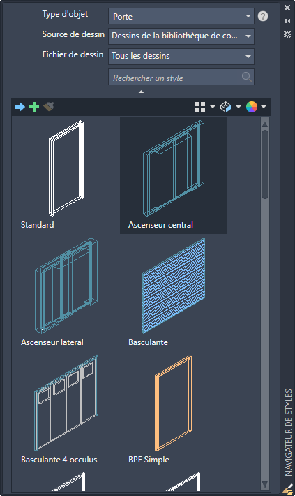 Affiche tous les styles d'objets disponibles en fonction des sélections. Aucun aperçu n'est généré pour les définitions de systèmes, seul leur nom est affiché.