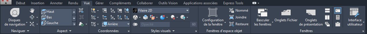 L'onglet Vue permet de définir et modifier les vues et de naviguer dans le dessin depuis un emplacement centralisé.