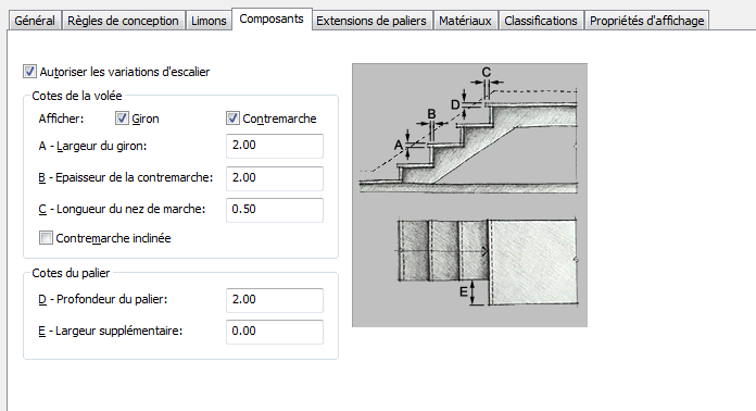 Remarque : Si l'option Autoriser les variations d'escalier est cochée, les modifications apportées depuis cet onglet n'ont aucun effet sur les escaliers existants. Pour appliquer les paramètres de style aux escaliers qui existent déjà, sélectionnez l'escalier qui vous intéresse, affichez ses propriétés, accédez à la fiche de travail Composants et cliquez sur Rétablir les valeurs de style.