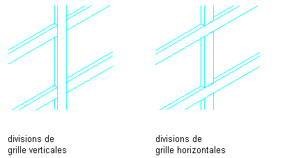 Les lignes horizontales et verticales de la grille de positionnement 2D définissent les divisions des grilles du mur-rideau. Les cellules de la grille, le dormant et les meneaux sont affectés de définitions par défaut.