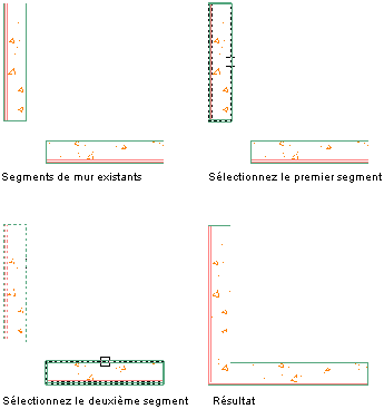 Cette procédure permet de raccorder deux murs. Les murs ainsi raccordés constituent un segment de mur courbé avec un rayon spécifique correspondant à la tangente aux lignes de base des murs sélectionnés.