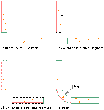 L'illustration suivante représente le raccordement de deux segments de mur dont le rayon est spécifié.