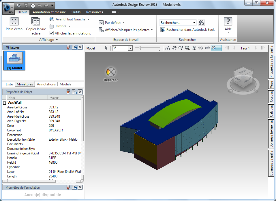 Vous pouvez publier les fichiers DWG et leurs données de jeux de propriétés sous forme de modèles 2D ou 3D au format DWF ou DWFx. Une fois ces fichiers affichés avec Autodesk Design Review, il est possible de sélectionner des composants d'objets et d'en afficher les informations dans la palette des propriétés.