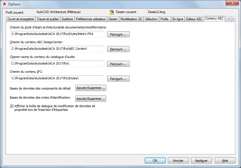 Spécification des options de contenu AEC par défaut pour le dessin en cours