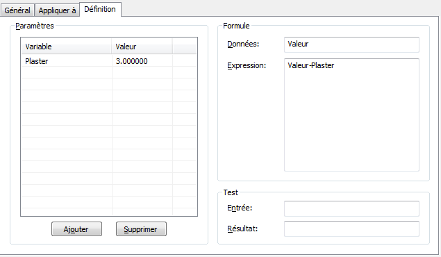 . Une variable est composée de son nom et de sa valeur. Pour créer, par exemple, une déduction d'enduit de 3 %, cliquez sur Ajouter, entrez Plaster_Deduction dans le champ Variable et 0.97 dans le champ Valeur.