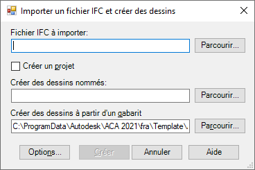 Lorsque vous importez un fichier IFC, des fichiers de dessin correspondant à chaque partie de la structure du projet IFC sont créés. Ces fichiers sont référencés en externe dans un fichier hôte principal représentant le fichier IFC entier. Le processus d'importation crée également un fichier journal contenant des informations sur l'emplacement géographique et les objets. Ce fichier est stocké dans le même emplacement que le fichier IFC importé. Les fichiers IFC peuvent être importés dans un projet Jeu d’outils AutoCAD Architecture 2027 ou en tant que dessins indépendants.
