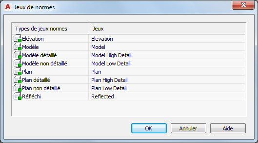 La colonne Types de paramètres standard affiche tous les paramètres d'affichage par défaut du dessin. La colonne Paramètres affiche le paramètre par défaut spécifié pour chaque paramètre d'affichage par défaut.
