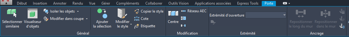 - Les onglets contextuels s'affichent en fonction des objets sélectionnés à l'écran. Si vous sélectionnez une porte, par exemple, l'onglet contextuel des portes s'affiche. Les options disponibles dans ces onglets sont celles du menu contextuel de l'objet sélectionné.
