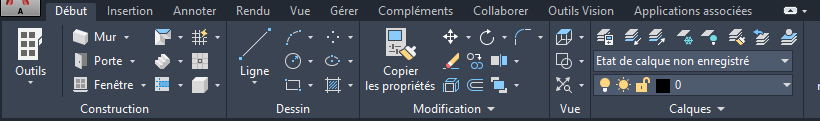 Le ruban centralise l'accès aux commandes d'Jeu d’outils AutoCAD Architecture 2027. Le ruban s'organise en plusieurs onglets correspondant aux tâches courantes du processus de dessin. Il existe deux types d'onglets :