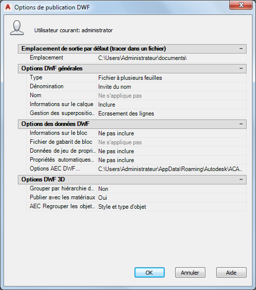 Lorsque vous créez un fichier DWF ou DWFx depuis la boîte de dialogue Publier, vous pouvez créer des fichiers DWF ou DWFx 2D ou 3D. Vous pouvez également créer plusieurs fichiers DWF ou DWFx pour des feuilles individuelles du dessin. Si vous exportez des données de jeux de propriétés, celles-ci s'afficheront dans chaque fichier DWF ou DWFx.