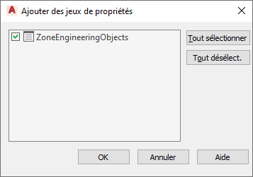 - Dans la boîte de dialogue Ajouter des jeux de propriétés, sélectionnez ObjetsZoneIngénierie et cliquez sur OK.