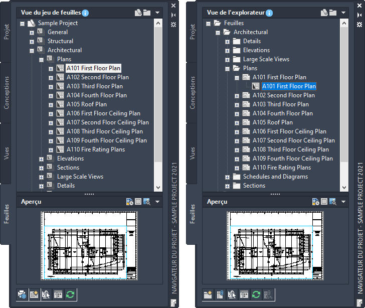 Onglet Feuilles avec vue du jeu de feuilles du projet (gauche) et vue de l'explorateur (droite)