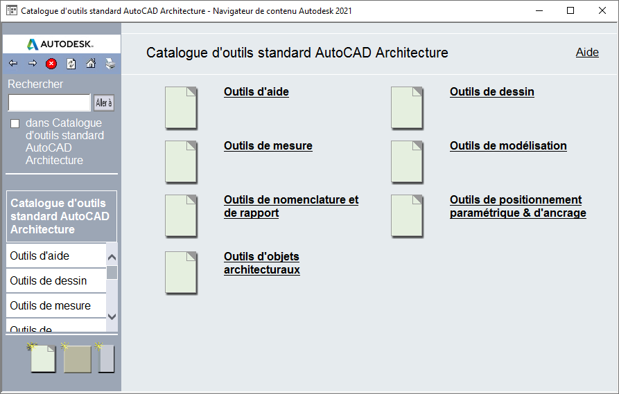 Pour accéder aux pages suivantes du catalogue d'outils, cliquez sur le nom du catalogue dans le volet gauche du Navigateur de contenu.