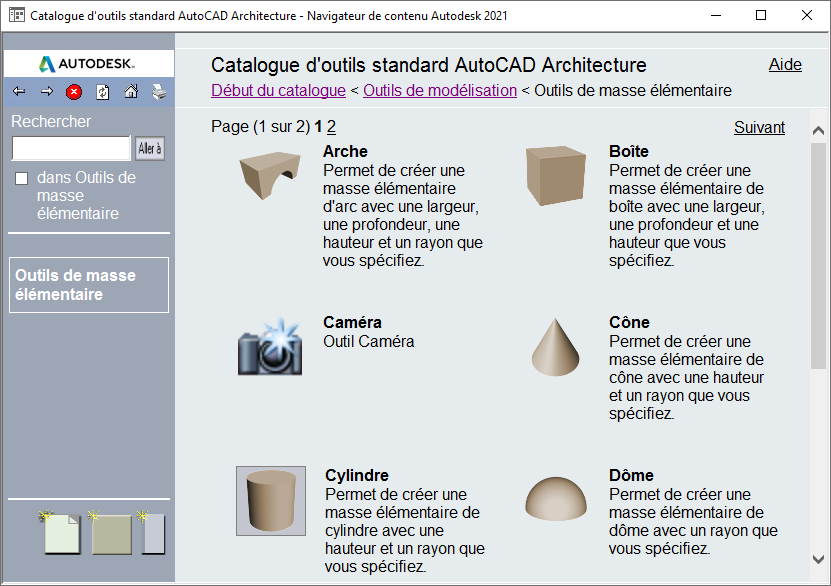 Une catégorie de catalogue d'outils peut contenir plusieurs éléments sur une même page. Si plusieurs pages sont nécessaires, des commandes de navigation apparaissent en haut et en bas de chacune d'elles. La catégorie d'outils de masse élémentaire mentionnée plus haut affiche son contenu sur deux pages. Vous pouvez spécifier la page à afficher en cliquant sur son numéro ou en cliquant sur Suivante ou Précédente. Notez que ces boutons de commande apparaissent aussi en bas de la page. Vous pouvez également changer le nombre des éléments qui s'affichent dans une page du Navigateur de contenu.