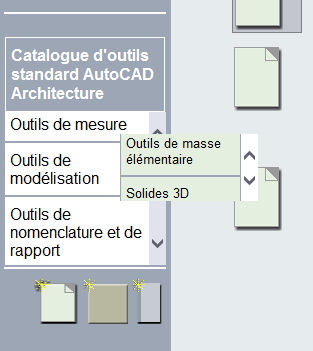 Les catégories peuvent être divisées en plusieurs niveaux. Si une catégorie contient des sous-catégories, leur liste s'affiche lorsque vous déplacez le curseur sur le nom de la catégorie dans le volet gauche. Par exemple, dans le Catalogue d'outils standard, positionnez le pointeur sur les outils de modélisation pour visualiser les sous-catégories d'outils de masse élémentaire et de solides 3D.