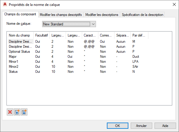 Chaque norme de calque définit le nombre de champs de composant qui constituent un nom de calque et stipule les règles applicables au contenu de chacun des champs. Si vous créez ou modifiez une norme de calque, vous devez accéder aux propriétés de cette norme pour pouvoir modifier les champs de composant.