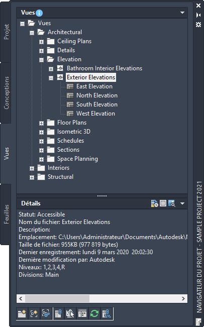 Vues de l'espace objet avec élévations extérieures dans le Navigateur du projet
