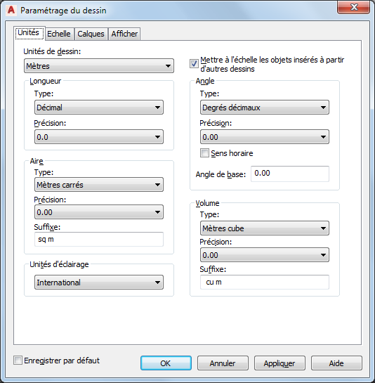 Lorsque vous modifiez les unités de dessin, les options par défaut des zones Aire et Volume changent également pour s'adapter aux nouvelles unités. Les options de l'échelle de dessin sous l'onglet Echelle changent également.