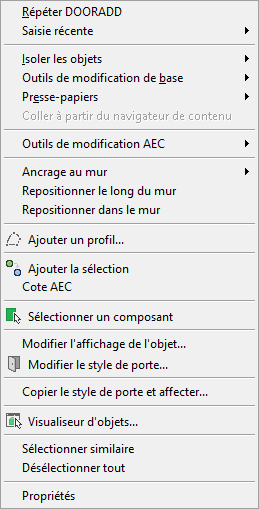 Si vous cliquez avec le bouton droit de la souris sur la zone de dessin, le contenu du menu contextuel dépend du ou des objets sélectionnés. Par exemple, si vous avez sélectionné des objets porte, le menu contextuel spécifique aux portes s'affiche, comme illustré ci-dessous.