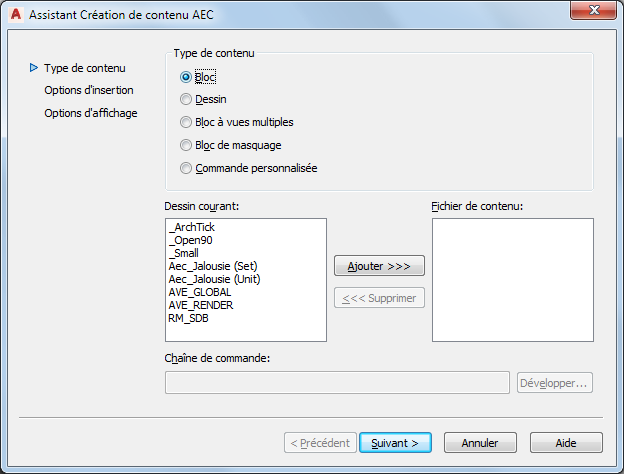 L'Assistant Création de contenu AEC permet de créer du contenu personnalisé. Vous pouvez ainsi créer des blocs, des dessins et des commandes à partir de données présentes dans le dessin actif.
