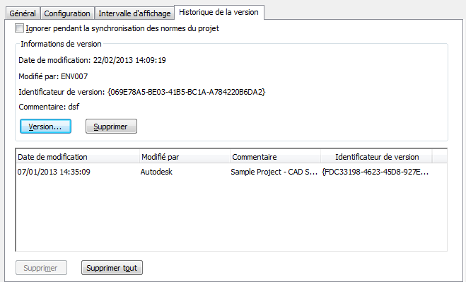 A chaque paramètre d'affichage dans un dessin aux normes du projet correspond un historique des versions. Cet historique affiche l'identification de version unique, la date et l'heure de la modification, le nom de l'utilisateur et tout commentaire entré par l'utilisateur.