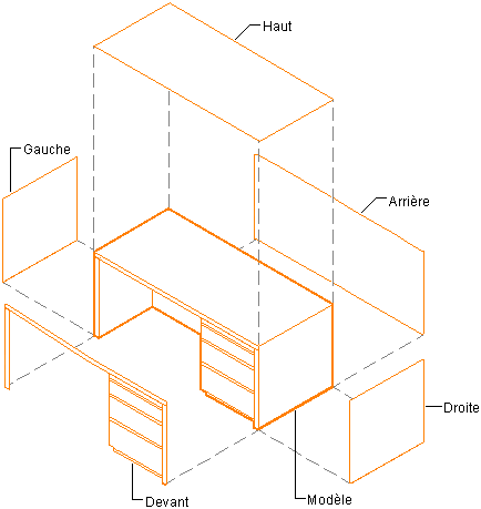 Par exemple, si vous spécifiez le point d'insertion de base du bloc de visualisation modèle comme point médian du bord inférieur du côté inférieur, les blocs de visualisation Face et Arrière disposent alors d'un point d'insertion de base situé dans la partie médiane du bord inférieur. Les blocs de visualisation Droit et Gauche possèdent un point d'insertion de base qui se trouve dans le coin inférieur de la partie arrière. Le point d'insertion de base des blocs de visualisation Haut et Bas est situé dans la partie médiane du bord arrière.